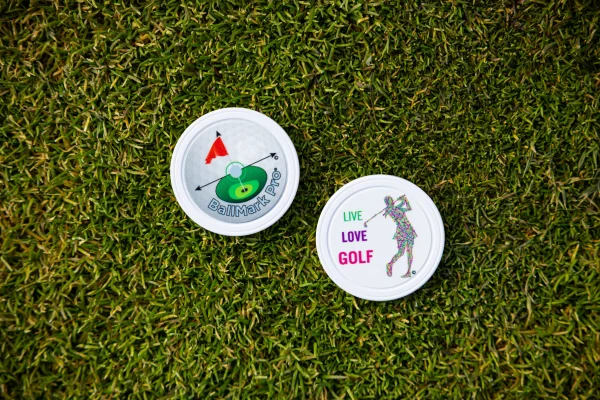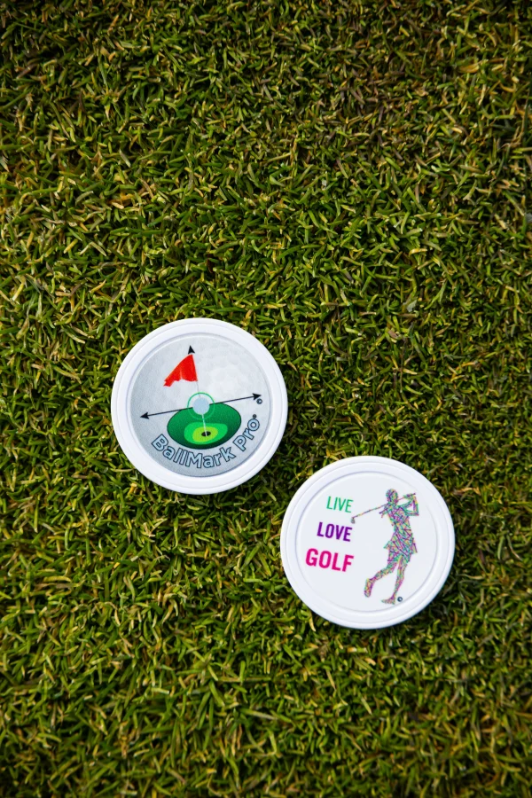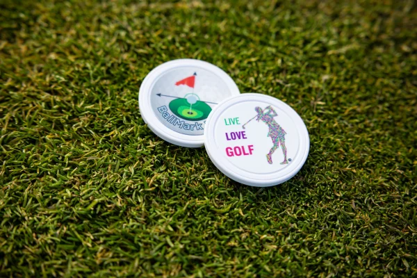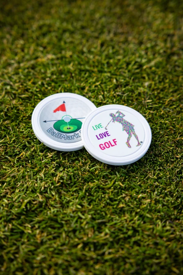 This Poker Size ball mark was developed to help with putter and ball alignment on the green. While the opposite side has been filled with lots of artwork and “sayings”.