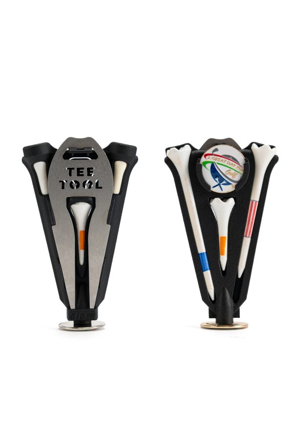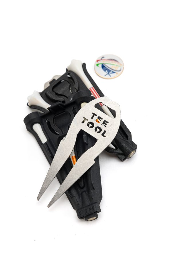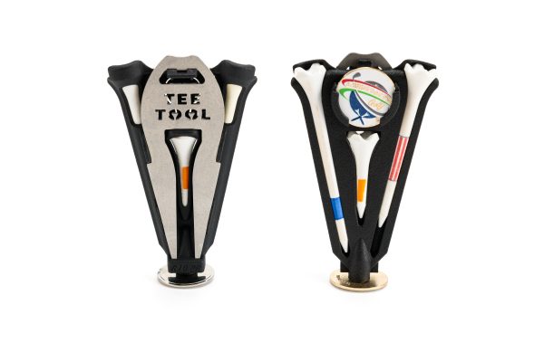 The TeeTool™ uses three Pride Professional Tee System golf Tees™. These Tees are the enhanced design and increased stability golf Tees produced by Pride. As noted on their packaging, these tees are aerodynamically designed for the longer drives. For these reasons, we selected the Pride Tees for use with our patented TeeTool™ product. The TeeTool™ holds all three golf tees so that you will always have the size tee that you need at the Tee Box!